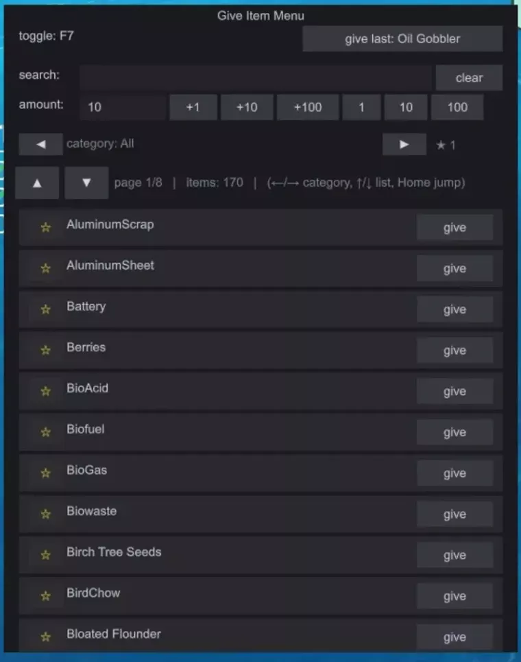 Give Item Menu для Flotsam — небольшой мод, который позволяет добавлять предметы напрямую в ваше поселение через удобное игровое меню. Как открыть меню - Клавиша F7 Особенности - Поисковый список предметов - Вкладки с категориями для удобного просмотра - Избранное для быстрого доступа - Запоминает последний выбранный предмет для быстрого добавления - Возможность регулирования количества