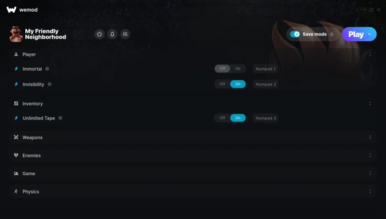 Функции: Immortal - Бессмертный Invisibility - Невидимость Enemies Can't Grab Player - Враги не могут схватить игрока Slow Enemies - Медленные враги Set Movement Speed Multiplier - Множитель скорости перемещения Unlimited Tape - Неограниченное количество ленты Unlimited Ammo - Бесконечные патроны Unlimited Grenades - Бесконечные гранаты Free Station - Бесплатные станции Free Snack Machine -