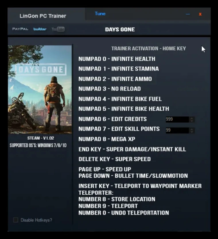 Days Gone "Трейнер +20 от LinGon: Здоровье, патроны, кредиты, опыт, невидимость, скорость, телепорт"