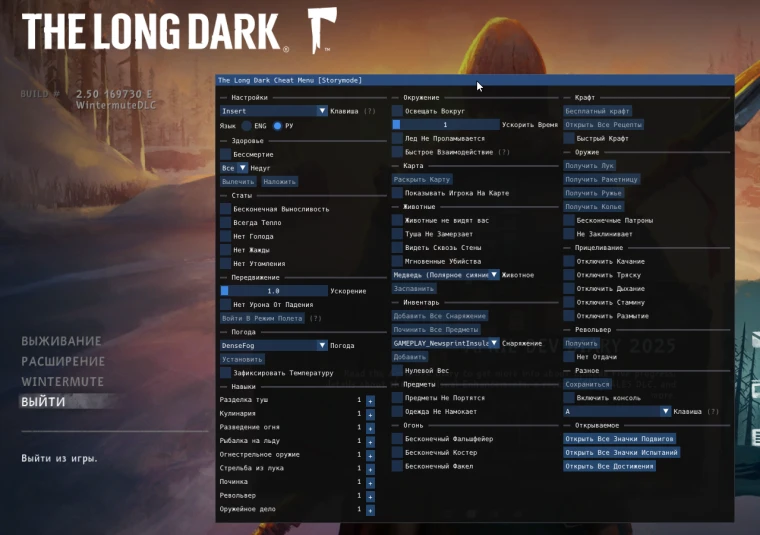 Внутриигровое меню для игры The Long Dark под Windows. Работает как для Survival (v2.50), так и для Wintermute (v2.20). Чит работает только на одиночную версию Установка: Скачать архив и распаковать в любое место (путь не должен содержать кириллицу). Запустить игру (Wintermute является отдельной игрой!) Перетянуть TLD_Cheat.dll на ModLoader.exe. Если ModLoader.exe запускается с ошибкой, то