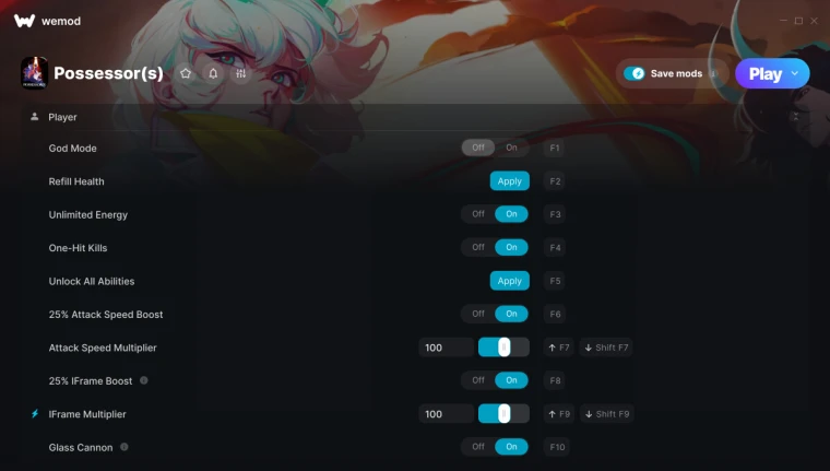 Функции: God Mode - режим Бога Refill Health - восстановить здоровье Unlimited Energy - неограниченная энергия One-Hit Kills - мгновенные убийства Unlock All Abilities - разблокировать все способности 25% Attack Speed Boost - 25% увеличение скорости атаки Attack Speed Multiplier - множитель скорости атаки 25% IFrame Boost - 25% увеличение неуязвимых моментов IFrame Multiplier - множитель