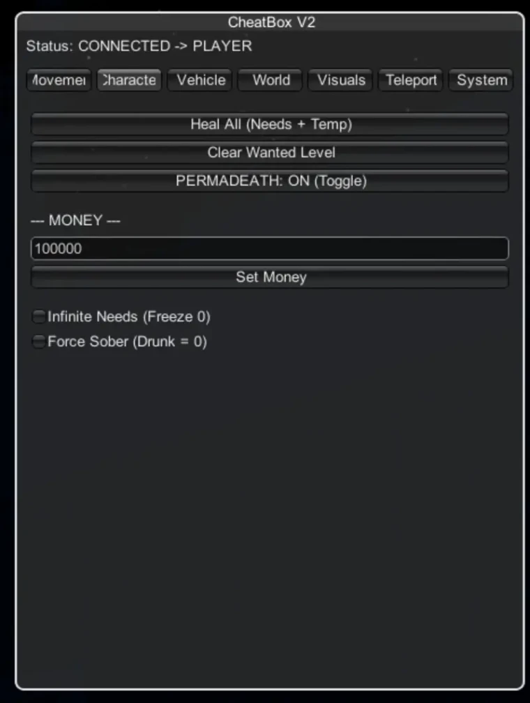 CheatBox V2 — универсальный инструмент для My Winter Car Это универсальный чит для игры My Winter Car, объединяющий наиболее полезные функции для выживания, сборки машины и исследования окружающего мира. Версия V2 оптимизирована для стабильной работы (без падений FPS) и исправляет критические ошибки с освещением. Основные функции - Игрок: заморозка всех показателей (голод, жажда, мочеиспускание,