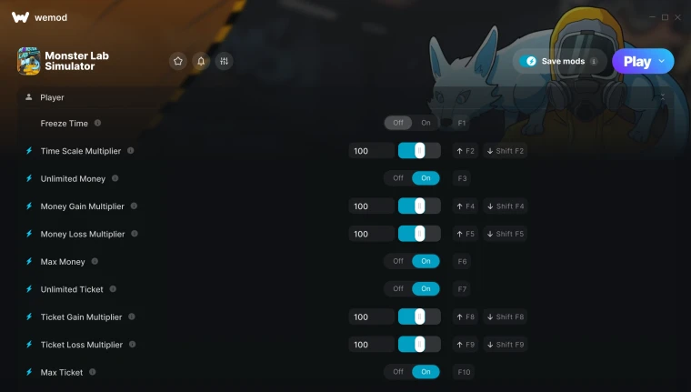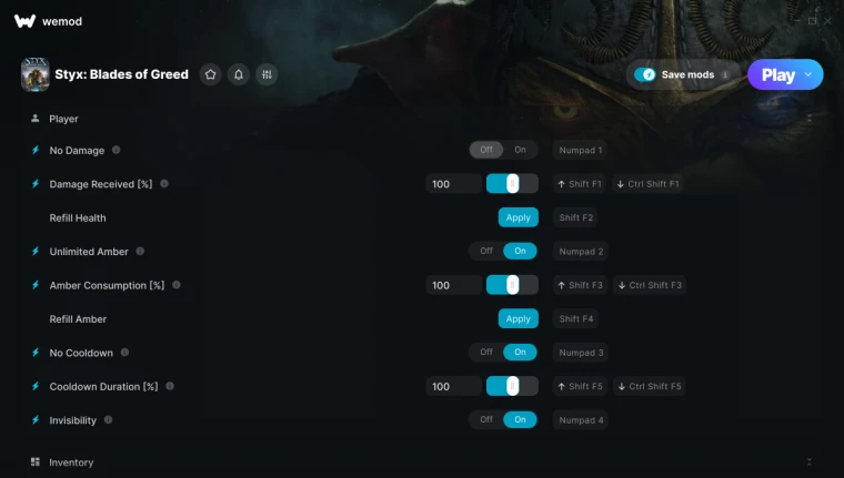 Функции: No Damage - Нет урона Damage Received [%] - Урон получен [%] Refill Health - Восстановить здоровье Unlimited Amber - Неограниченный янтарь Amber Consumption [%] - Потребление янтаря [%] Refill Amber - Восстановить янтарь No Cooldown - Без времени восстановления Cooldown Duration [%] - Продолжительность времени восстановления [%]