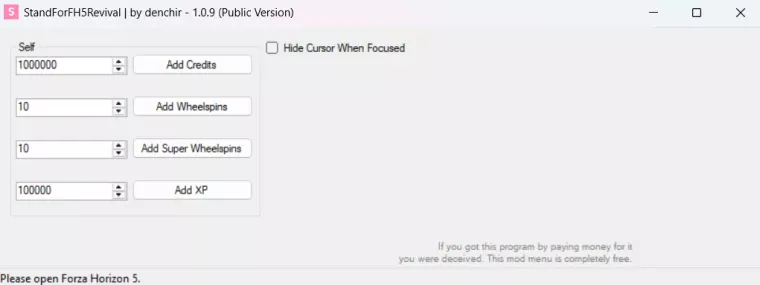 Возрождение старой программы Stand for FH5 — модифицированная версия чит-мода, адаптированная под актуальную версию игры. Позволяет мгновенно добавлять кредиты, опыт персонажа и вилспины без риска бана со стороны серверов игры.