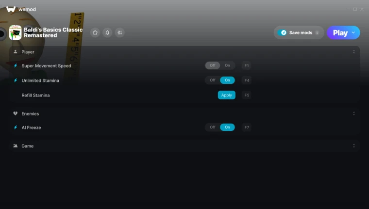 Baldi's Basics Classic Remastered "Трейнер +12 от WeMod: Скорость, выносливость, тетради и пр"