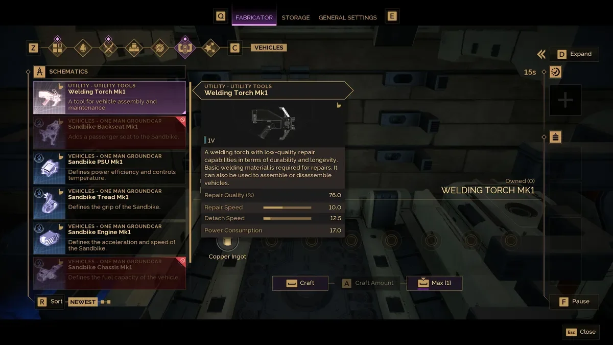 Сварочная горелка — это строительный инструмент, с помощью которого происходит соединение всех деталей байка. Топливный элемент необходим для работы транспортного средства, но со временем изнашивается, как и любой источник энергии. Изготавливаются такие элементы в малом химическом заводе, который нужно сначала исследовать и построить. Кроме того, топливные элементы можно найти на стоянках падальщиков и в укреплённых лагерях.