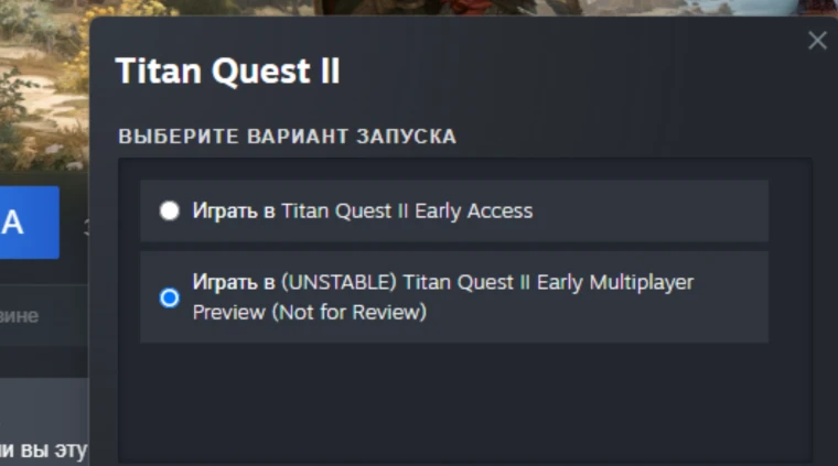 - Выберите правильный режим запуска: При запуске игры из вашей библиотеки Steam появится окно выбора. Необходимо выбрать второй вариант: «Играть в (НЕСТАБИЛЬНУЮ) Titan Quest II Early Multiplayer Preview (Не для обзоров)».
