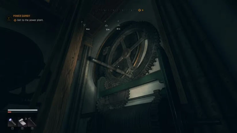 Когда стрелка окажется на нужной отметке, кабель нужно отсоединить и подняться на сервисный шкаф посередине зала. Держа провод в руках, предстоит прыгнуть на рычаг часового механизма, раскачаться и зацепиться за балки под потолком. Это откроет путь выше, в сторону безопасной комнаты.