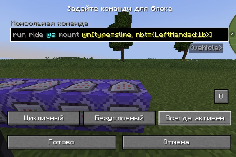Она тоже устанавливает значение useBrush на 0, только у всех игроков. Поставьте ещё один постоянно активный командный блок и пропишите туда execute as @p run execute on vehicle run data modify entity @n[type=minecraft:slime, nbt={LeftHanded:1b}] NoAI set value 0. execute as @p я уже ранее объяснял, поэтому пропустим. execute on vehicle run выполняет команду тогда, когда исполняющий команду (То есть мы) на транспорте. data modify entity @n[type=minecraft:slime, nbt={LeftHanded:1b}] NoAI set value 0 включает у нашего слизня ИИ. Но если слезть со слизня, то интеллект не отключится, и выключать в ручную не эффективно. Поэтому ставим ещё один постоянно активный повторяющий блок и вписываем execute at @p run execute if block ~ ~-0.1 ~ grass_block run data modify @n[type=slime, nbt={LeftHanded:1b}] NoAI set value 1. execute if block ~ ~ ~ grass_block run выполняет следующую команду только тогда, чуть ниже относительно игрока будет дёрн.
