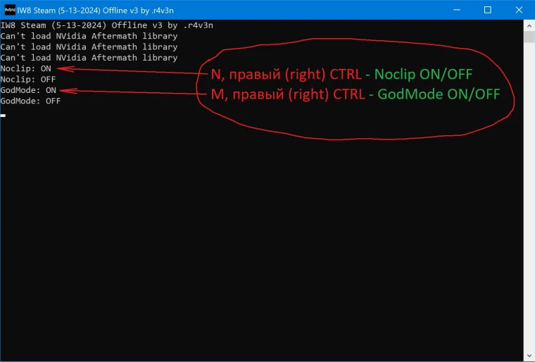 Нажимать не одновременно, а по очереди, непосредственно в самой игре или на паузе. Удостовериться, что чит включился можно в окошке запуска игры (скрин выше). Полёт сквозь стены (Noclip ON/OFF) - N, правый CTRL Бессмертие (GodMode ON/OFF) - M, правый CTRL