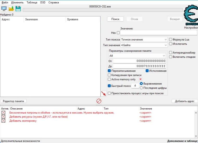Список функций: Бесконечные патроны в обойме - используется в миссиях. Нужно выбрать оружие. Добавить ресурсы (нужен Д.Р.У.Г. или на базе) Добавить экипировку. Процесс запуска: Запустить Cheat Engine, "Load" и выбрать таблицу "Select a process to open", выбрать нужный процесс. Выбрать нужную опцию, поставить крест.