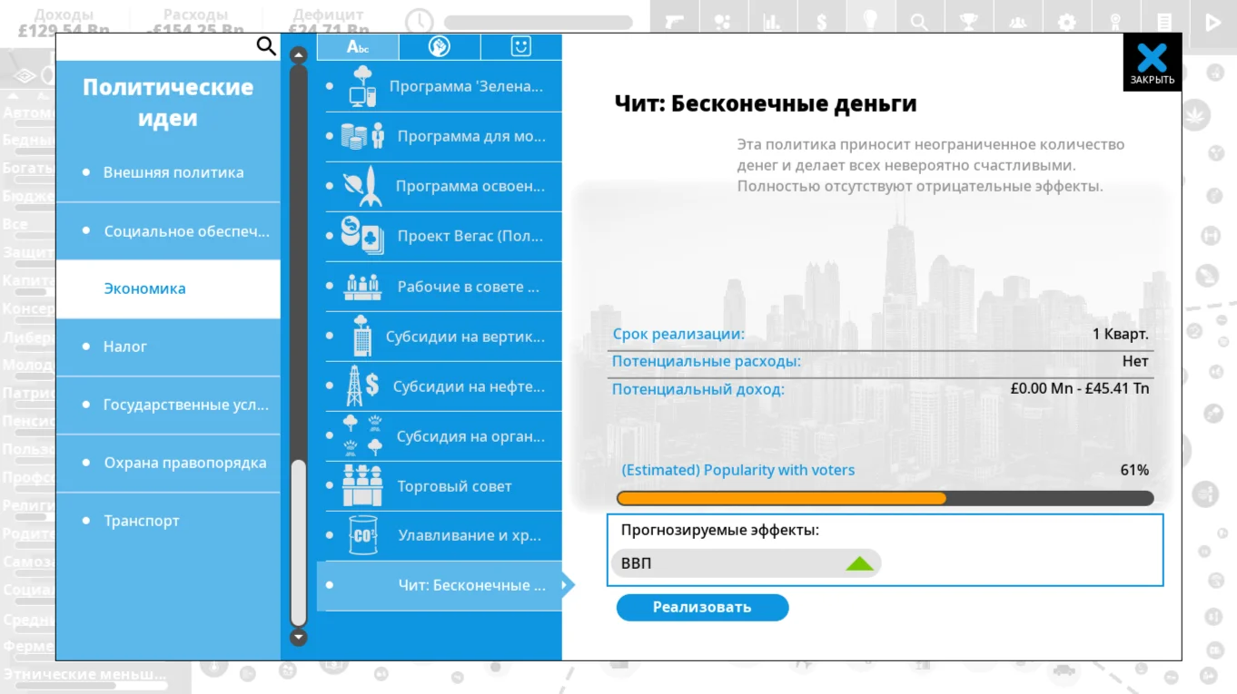 Простой и стабильный чит-мод, добавляющий новую экономическую политику "Чит: Бесконечные деньги". Инструкция по установке: Скачайте файл; Распаковать папку с модом по адресу C:Usersимя пользователяDocumentsMy Gamesdemocracy4mods Запустить игру Зайти в раздел моды и активировать