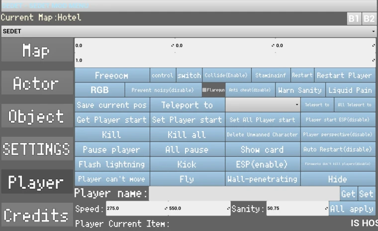 Функции: Unlimited Stamina - Бесконечная выносливость Game Speed - Редактировать скорость Infinite Jumps - Бесконечные прыжки Instant Acceleration - Мгновенное ускорение Set Walking Speed Multiplier - Множитель скорости ходьбы Set Sprint Speed Multiplier - Множитель скорости бега Set Crouch Speed Multiplier - Множитель скорости приседа Set Jump Height Multiplier - Множитель высоты прыжка