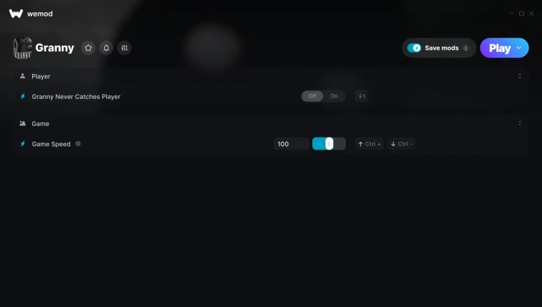 Функции: Granny Never Catches Player - Бабушка никогда не ловит игрока Game Speed - Скорость игры Инструкция по установке: Скачайте и установите WeMod, создайте бесплатный аккаунт. Найдите нужную игру в панели слева и добавьте путь к исполняемому файлу игры. Загрузите игру, активируйте функции при помощи горячих клавиш в бесплатной версии. Клавиши можно изменять, активация функций мышкой