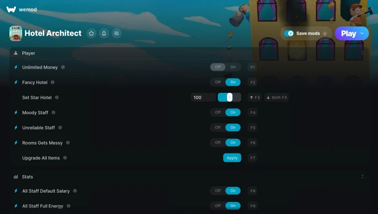 Hotel Architect "Трейнер +22 от WeMod: Редактор игрока, отеля, сотрудников, клиентов"