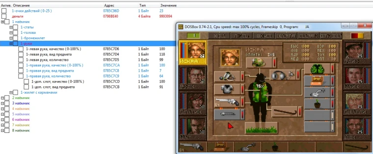 Данная таблица позволяет изменять или вообще создавать из ничего любые предметы, находящиеся на наёмнике или его инвентаре; + возможность изменить его характеристики. Проверено на GOG версии, с установленным русификатором от Бюро переводов Old-Games. Как пользоваться: Запустить игру Запустить Cheat Engine, выбрать процесс "DOSBox..", загрузить таблицу "Привязать" таблицу к