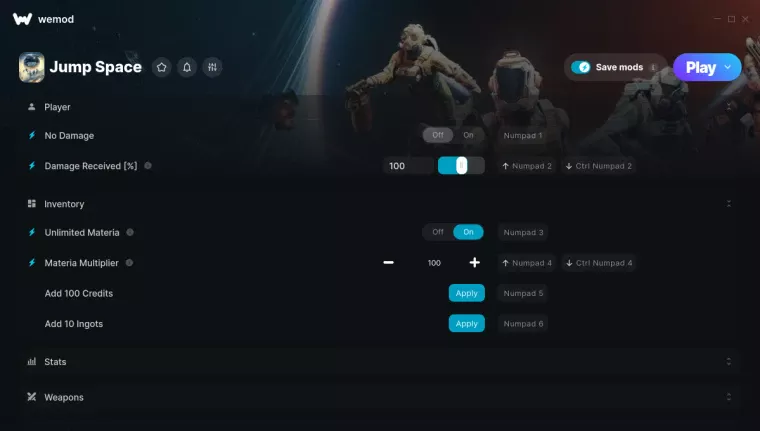 Функции: No Damage - Без урона Damage Received [%] - Получаемый урон % Unlimited Materia - Неограниченная материя Materia Multiplier - Множитель материи Add 100 Credits - Добавить 100 кредитов Add Credits - Добавить кредиты Add 10 Ingots - Добавить 10 слитков Add Ingots - Добавить слитки Add 100 Experience - Добавить 100 опыта Add Experience - Добавить опыт Unlimited Ammo -