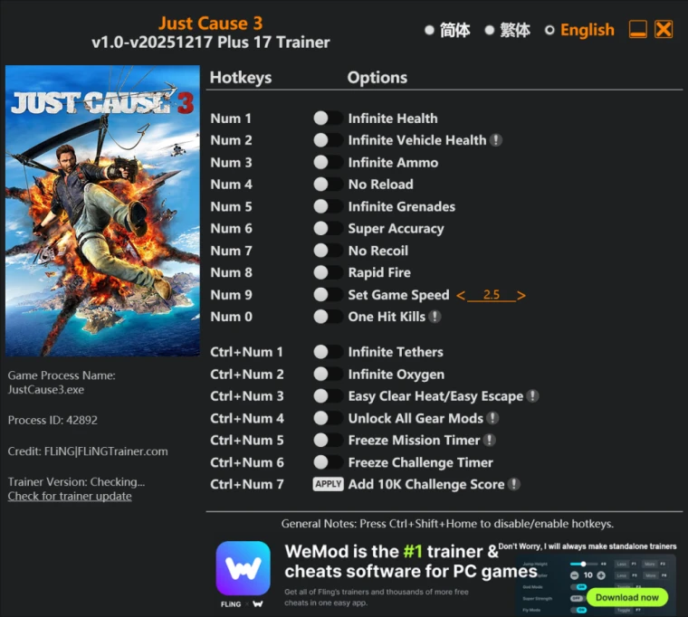 Just Cause 3 "Трейнер +17 от WeMod: Здоровье, кислород, патроны и пр"