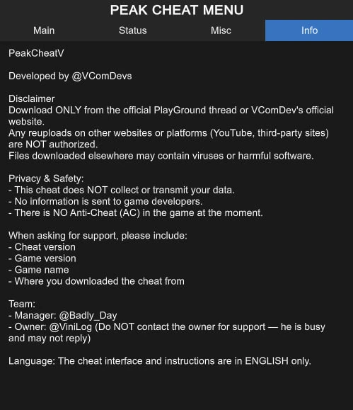 Небольшой чит мод с возможность спавна предметов и телепортом Функции: INSERT - Показать/скрыть меню мода F1 - Заспавнить выбранный предмет F2 - Обнулить все дебаффы F3 - Бесконечная выносливость F4 - Заморозить все дебаффы (бесконечное здоровье) F5 - Бесконечный прыжок (если задержать пробел, то почти как полёт) F6 - Высокая скорость спринта (хорошо сочетается с бесконечным прыжком) F7 - Высокая