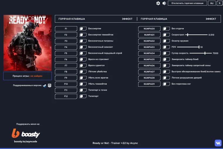 Автор: Async Издание: Any Версии игры: 91271 - 94572 Язык трейнера: RU / EN Количество Функций: 22 Дата Создания Трейнера: 05.10.2025 Функции: F1: Бессмертие F2: Бессмертие тиммейтов F3: Бесконечные патроны F4: Бесконечный химсвет F5: Бесконечный перцовый спрей F6: Враги не стреляют F7: Враги сдаются F8: Лёгкие убийства F9: Убить всех врагов F10: Убить тиммейтов F11: Телепорт к точке (Сохранить