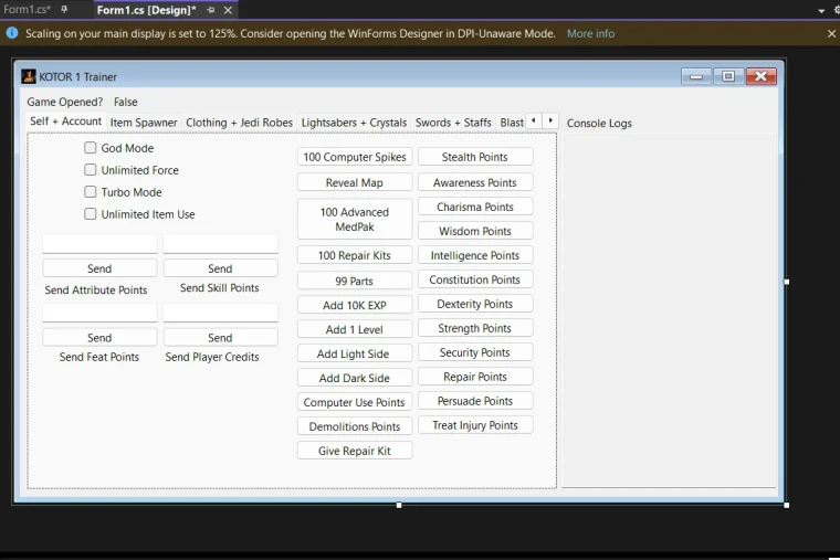 Это приложение на C# Windows Forms создано для удобного и быстрого использования чит-кодов в игре Star Wars: Knights of the Old Republic (KOTOR 1). Основные возможности - Автоматическое выполнение читов При выборе читы программа автоматически ставит окно игры (kotor.exe) на передний план, открывает внутриигровую консоль, вводит выбранный чит (например, e.ggivecomspikes) и нажимает Enter — вам не