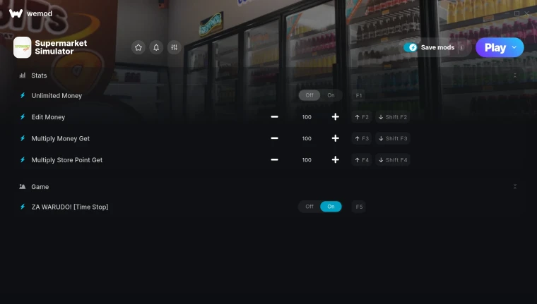 Функции: Unlimited Money - Неограниченные деньги Edit Money - Редактировать деньги Multiply Money Get - Умножить полученные деньги Multiply Store Point Get - Умножить полученные очки магазина Game - Игра ZA WARUDO! [Time Stop] - ВРЕМЯ ОСТАНОВИТСЯ! [Стоп времени] Game Speed - Скорость игры Инструкция: Скачайте и установите WeMod, создайте бесплатный аккаунт. Найдите нужную игру в