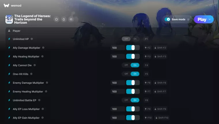 Функции: Unlimited HP - Неограниченные HP Ally Damage Multiplier - Умножитель урона союзников Ally Healing Multiplier - Умножитель лечения союзников Ally Cannot Die - Союзники не могут умереть One-Hit Kills - Убийства с одного удара Enemy Damage Multiplier - Умножитель урона врагов Enemy Healing Multiplier - Умножитель лечения врагов Unlimited Battle EP - Неограниченный боевой EP Ally EP Loss